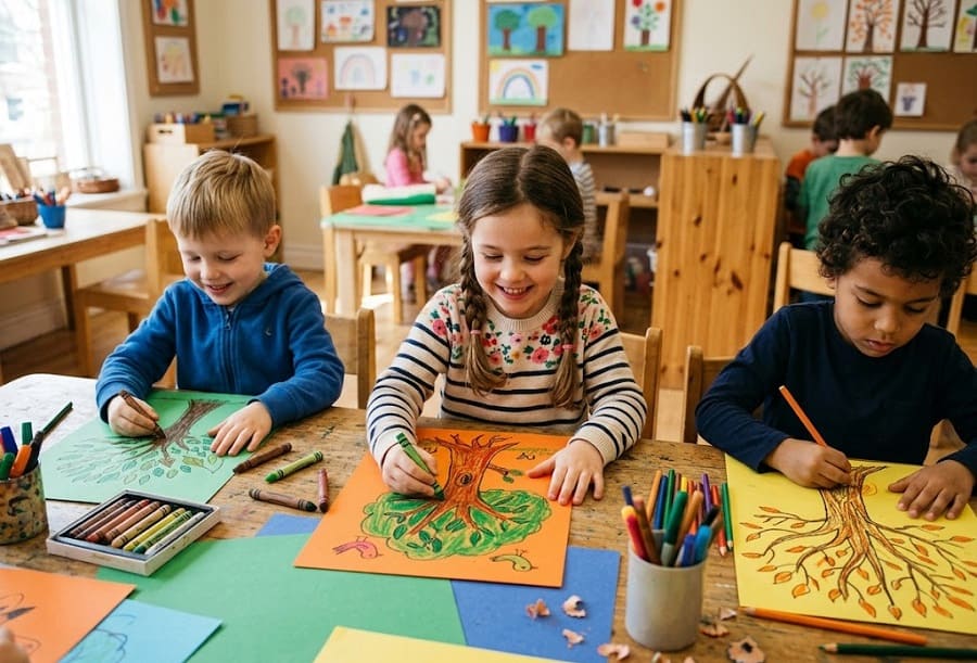 Alcuni bambini disegnano alberi giganteschi che toccano il cielo. Altri aggiungono animali tra i rami o case sugli alberi. In questo modo l’attività artistica diventa una forma di espressione personale.